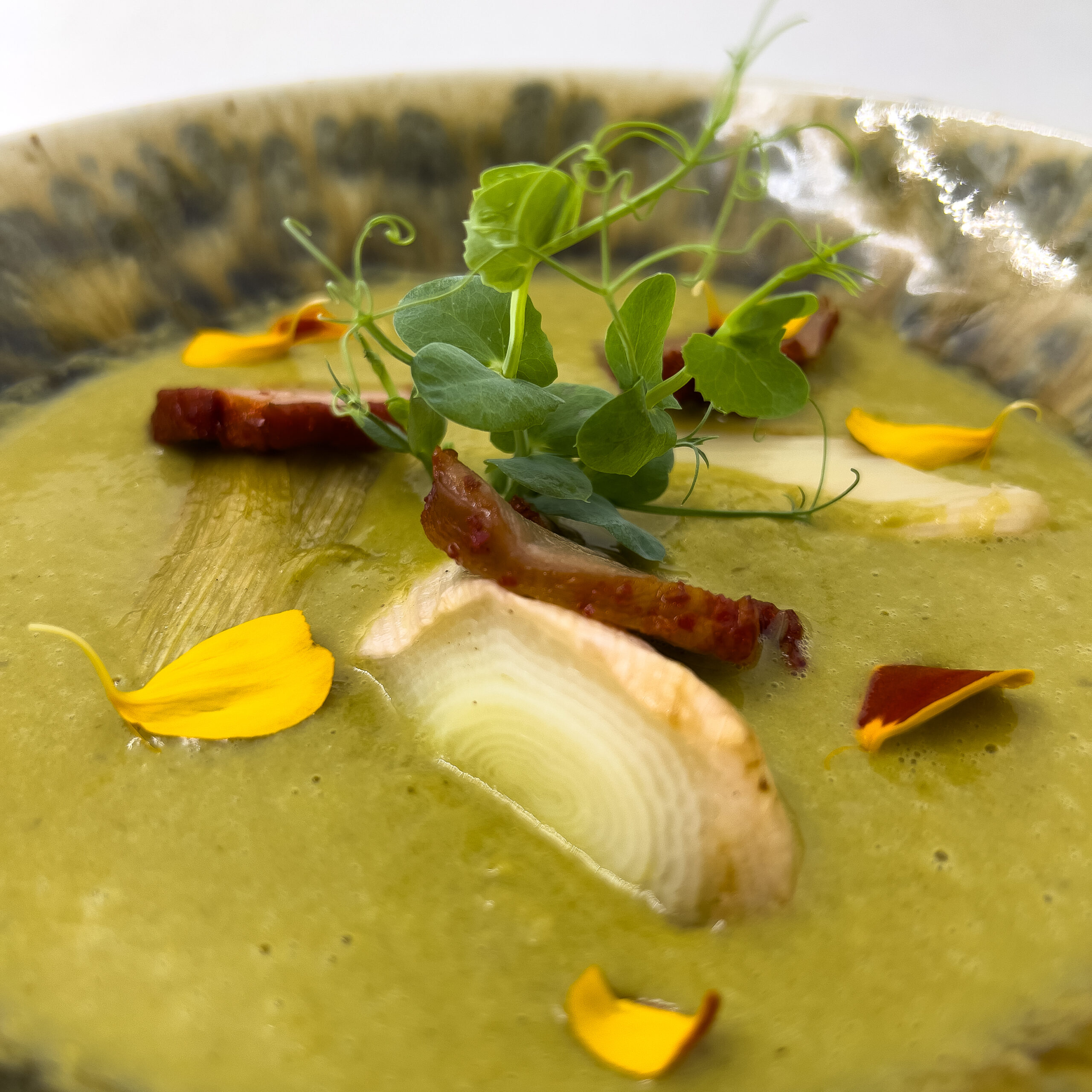 La caresse du mascarpone et du poireau, contrastée par le croquant fumé et épicé d’un filet mignon au piment d’Espelette