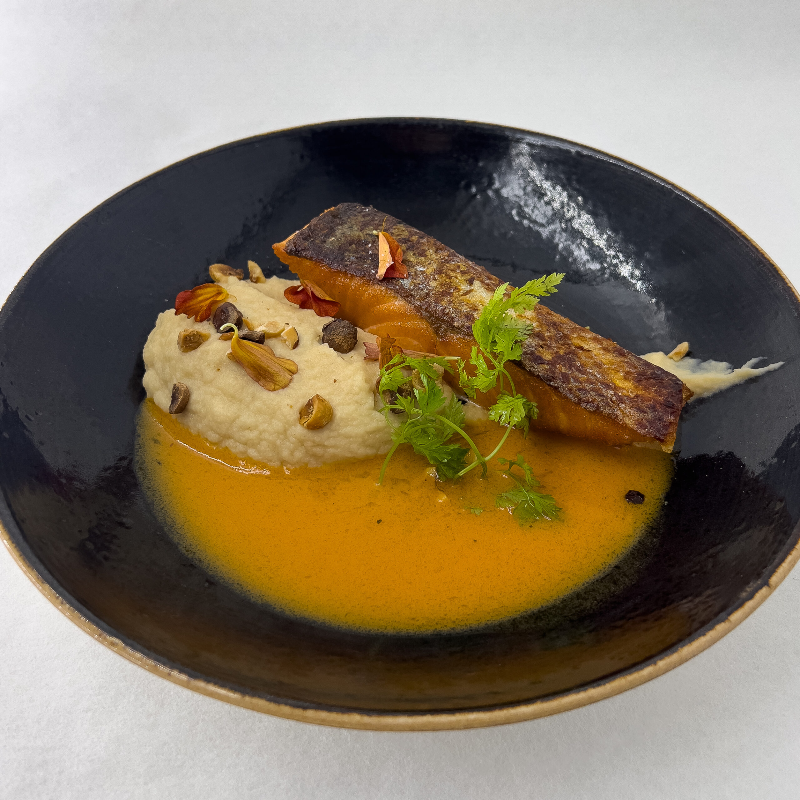 Pavé de saumon, beurre de carottes, mousseline de céleri-rave & éclats de noisettes – 22€